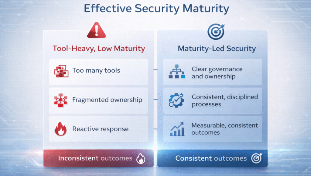 Without governance and process, tools operate in silos, risk remains unmanaged, and response is inconsistent. Mature security programs prioritise risk-based decision making, visibility and accountability, and continuous uplift.